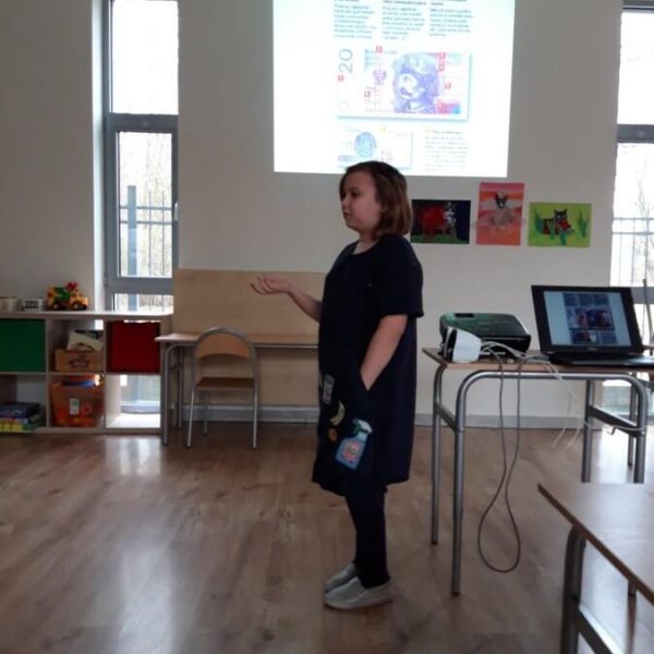 W dniu 19.03.2019 roku uczniowie III poziomu prezentowali wyniki swojej pracy nad projektami edukacyjnymi. Jako pierwsza wykład połączony z prezentacją multimedialną przedstawiła Ala. Trzeba szczerze powiedzieć, iż nawet zaproszeni zawodowcy zajmujący się prowadzeniem warsztatów i zajęć na co dzień byli pod wrażeniem poziomu przekazania swojej wiedzy przez Alę Dowiedzieliśmy się dzięki Niej wiele na temat zabezpieczeń polskich banknotów przed fałszerstwem, jak odróżnić oryginalny banknot od podrobionego, gdzie wymienić uszkodzony banknot oraz ile procent banknotu np. zjedzonego przez psa kwalifikuje go do wymiany na nowy i gdzie można go wymienić